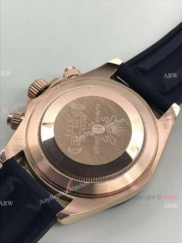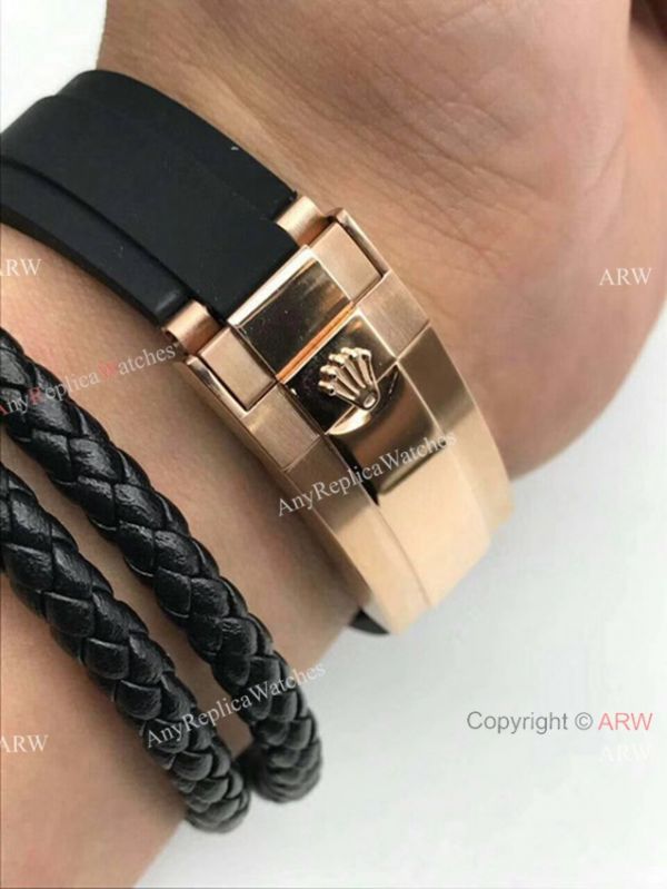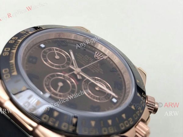 This is the NEW Model Replica Rolex Daytona watch. Everose gold case, Brown Chocolate face with arabic numerals. New Black Ceramic bezel set. Black rubber band Features Rose Gold Oyster clasp.