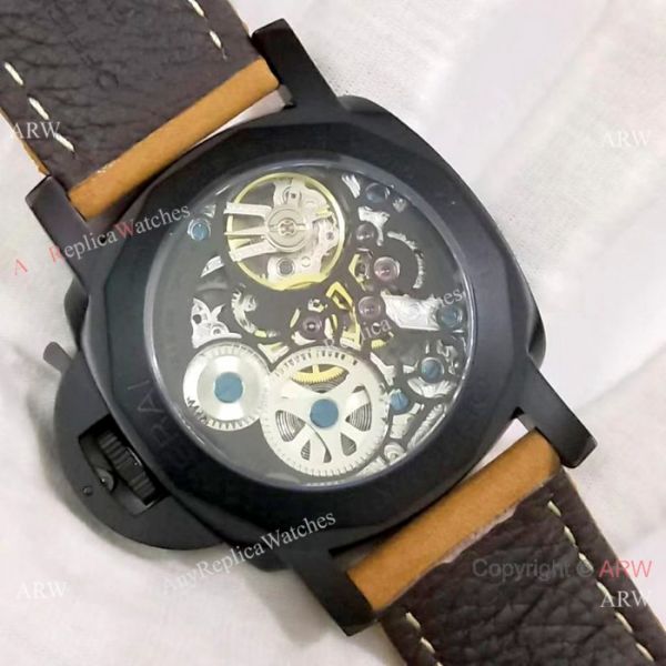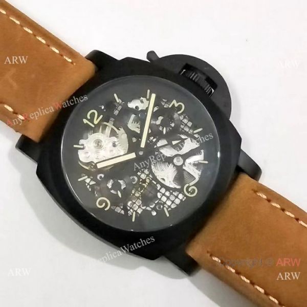 Black Steel case, Skeleton Dial, Brown Markers, Brown leather band with PANERAI personalised buckle