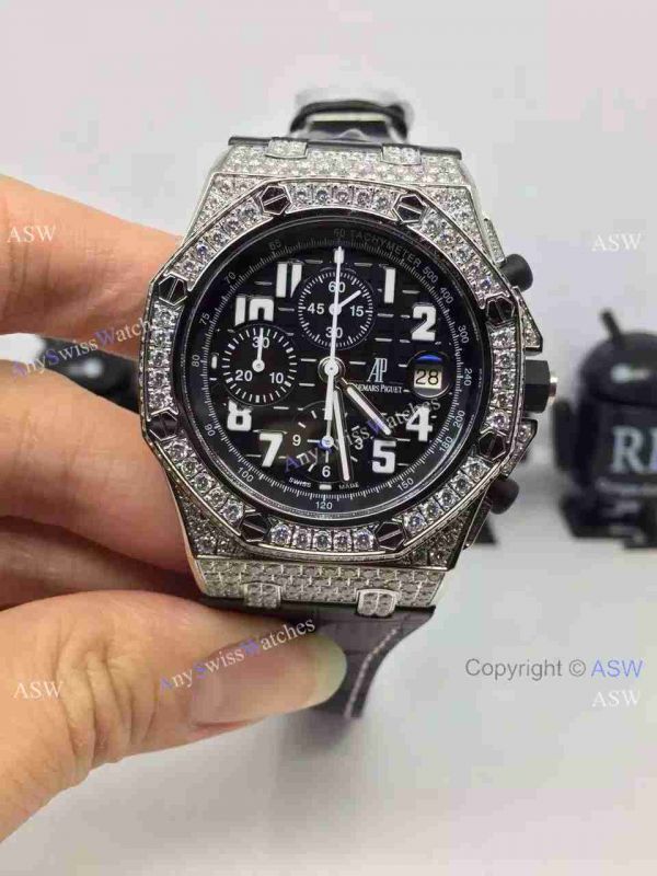 Swiss Replica Audemars Piguet Royal Oak Offshore Watch - SS Diamond Watch case / Diamond Bezel / Black Leather strap