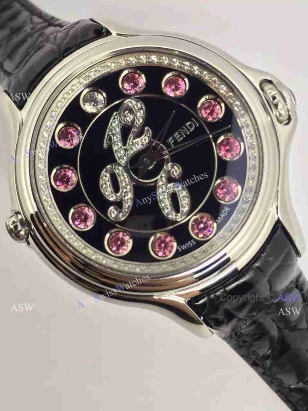 Swiss Quality Replica Fendi Watches Crazy Carats Diamond Gender: 33mm Ladies Size for this Fendi Crazy Carats Watch Knock off Movement: Best Swiss Quartz movement - Problem free - Thin and same as original quality Crystal: Real Sapphire Crystal Watchband: Genuine Black leather watch band with original style pin buckle Watch Dial: Black dial w/ Rainbow diamond Markers Watch Case: Stainless steel, The watches we sell are Swiss Grade Replicas, We guarantee this is the highest quality Swiss Fendi watches Crazy Carats you can buy. You will receive the same watches as shown. Buy now at discounted price.