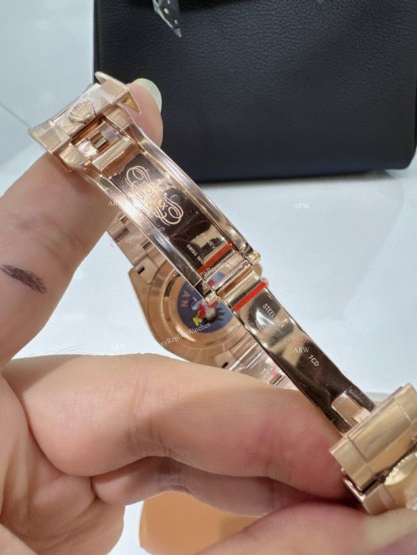 * Rolex crown logo micro etched at 6 oclock on the crystal, screw links, serial number between links. Solid end links