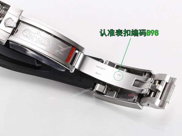 * Rolex crown logo micro etched at 6 oclock on the crystal, screw links, serial number between links. Solid end links
