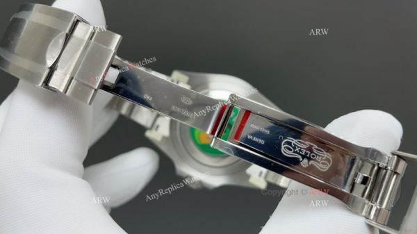 * Rolex crown logo micro etched at 6 oclock on the crystal, screw links, serial number between links. Solid end links