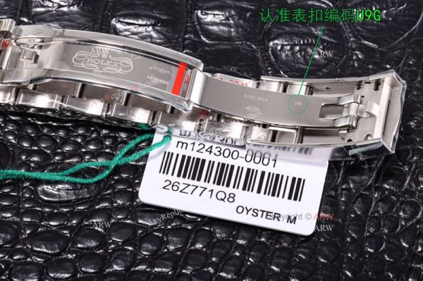 * Rolex crown logo micro etched at 6 oclock on the crystal, screw links, serial number between links. Solid end links