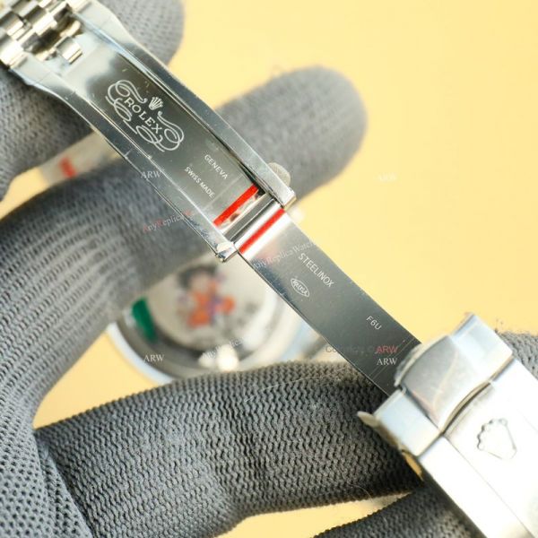 * Rolex crown logo micro etched at 6 oclock on the crystal, screw links, serial number between links. Solid end links