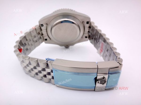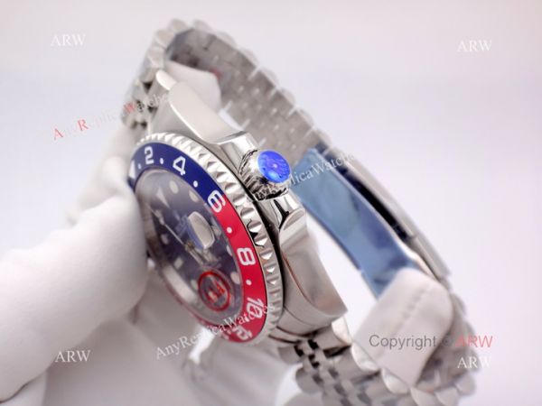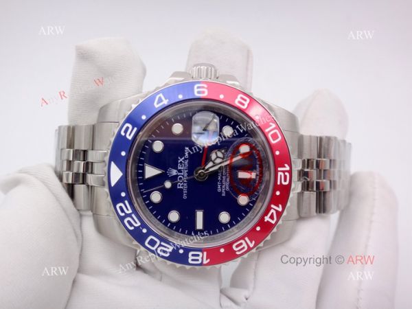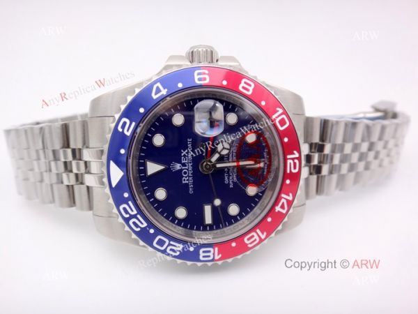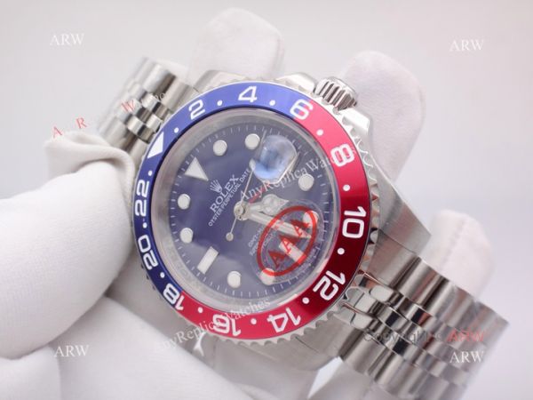 This ROLEX GMT MASTER 2 blue red ceramic bezel replica watch is fresh out the kitchen in the fake watches world. New released.