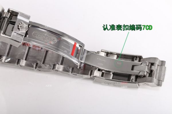 * Rolex crown logo micro etched at 6 oclock on the crystal, screw links, serial number between links. Solid end links