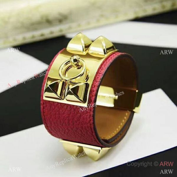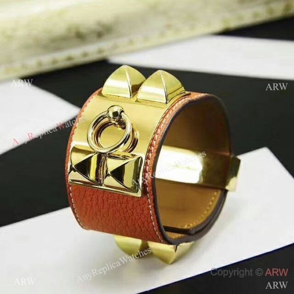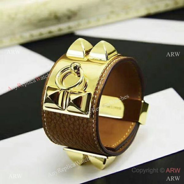 Copy Hermes Leather Bracelet with Gold Studded