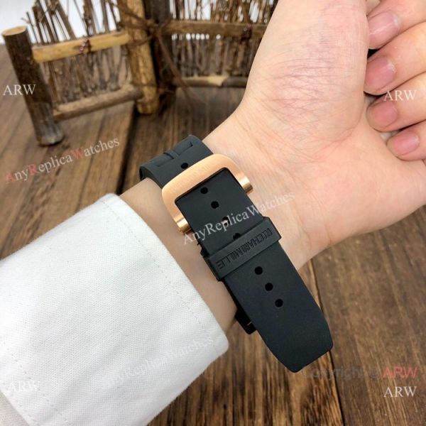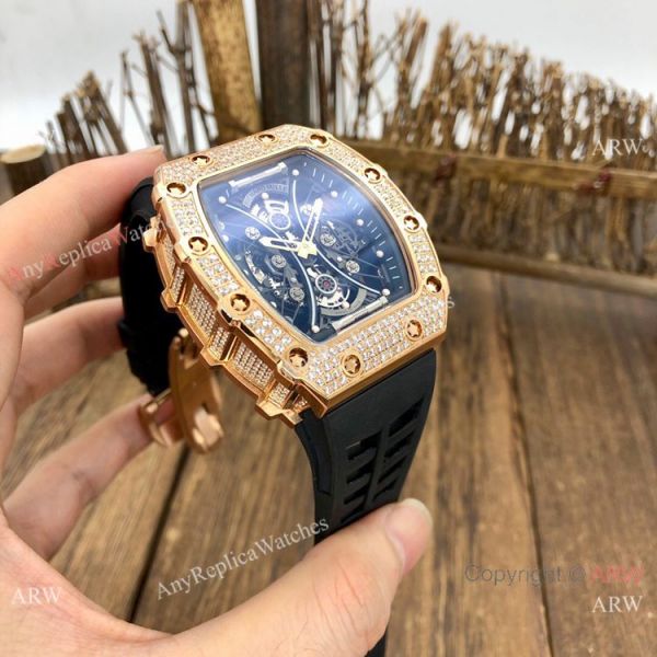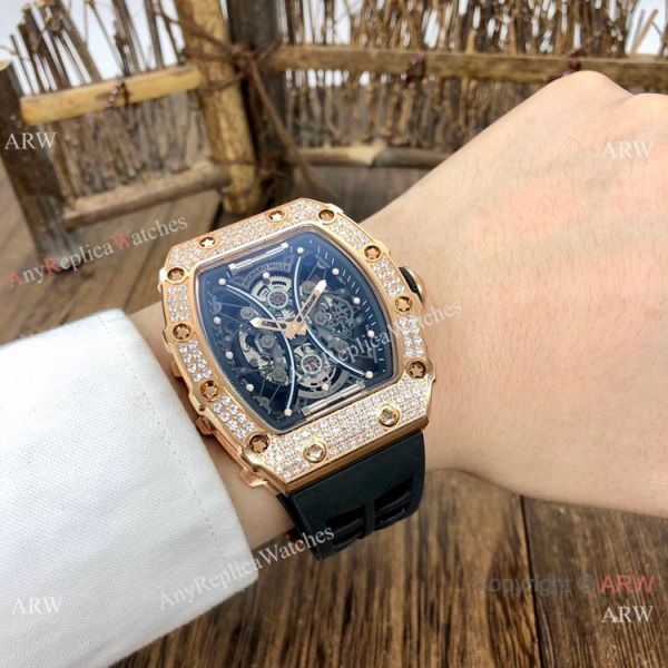 316l Rose Gold Diamond Case Black Rubber Bracelet Skeleton Dial Richard Mille Watch