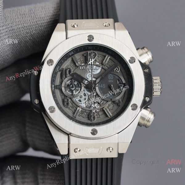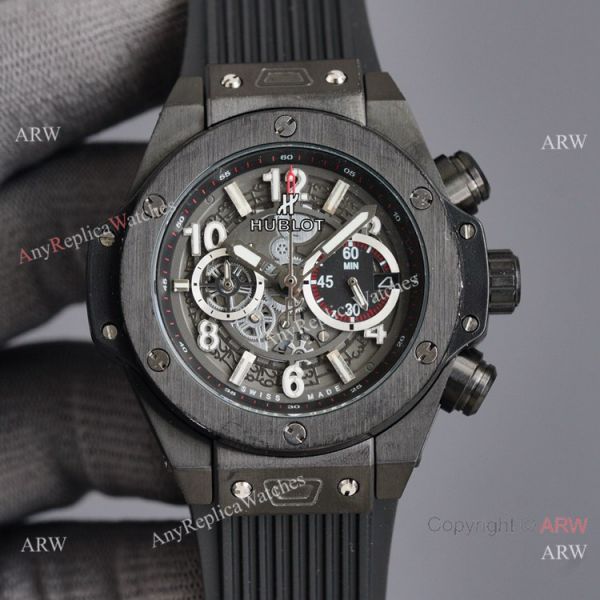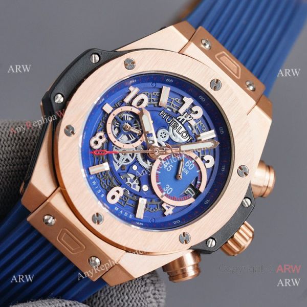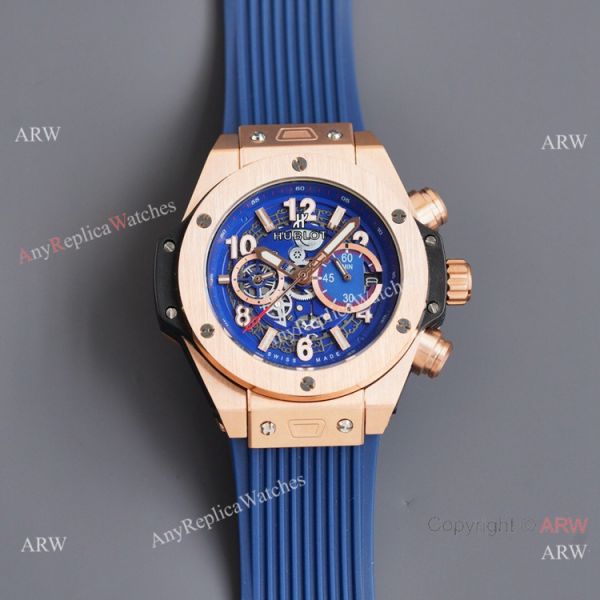 316L Stianless Steel coated Black Case Black Dial Blue Rubber Strap Hublot Knockoff Watch