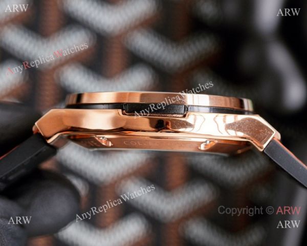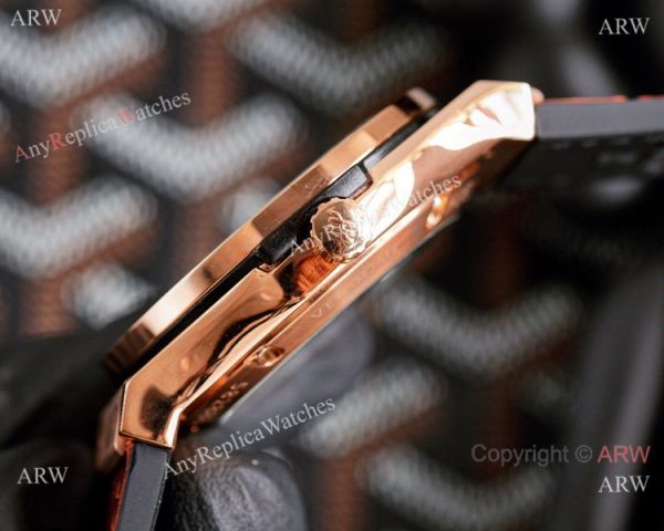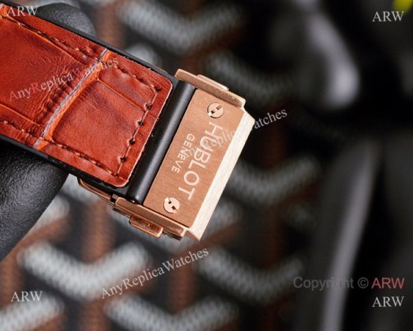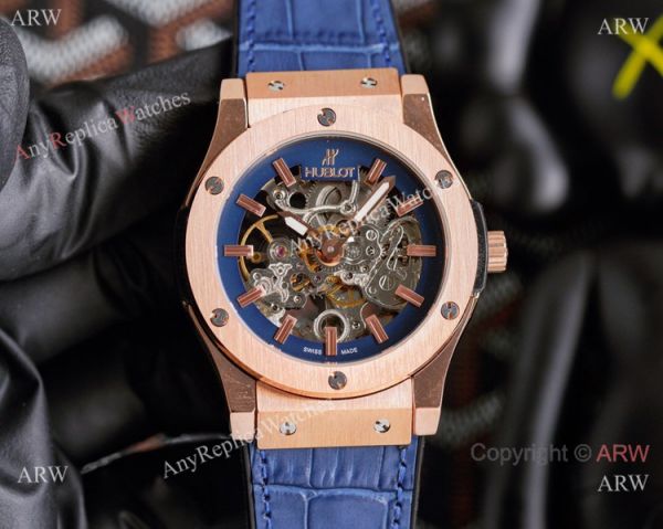 316L Stainless Steel coated Rose Gold Watch Case Skeleton Dial Black Gummy Strap Hublot Knockoff Watch