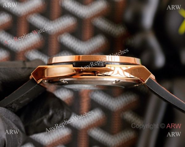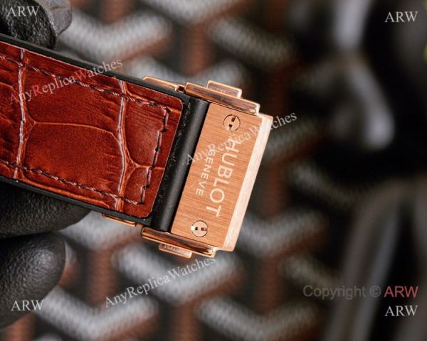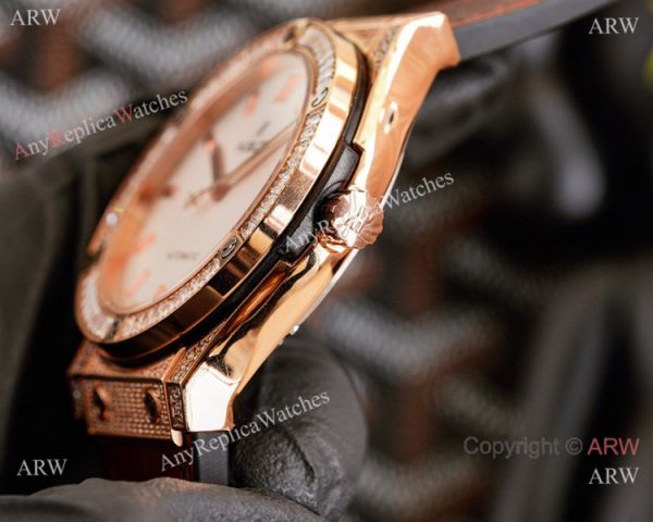316L Rose Gold Diamonds Watch Case White Dial Brown Gummy Strap Hublot Knockoff Watch