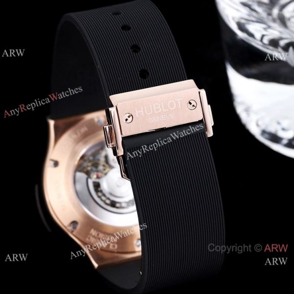 All the appropriate Hublot markings in all the appropriate places, including the clasp, dial, and back.