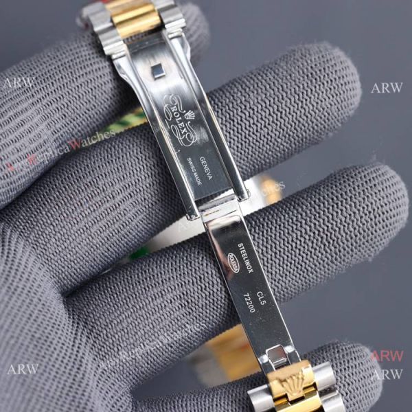 Rolex crown logo micro etched at 6 o'clock in the crystal, screw links, Solid end links.