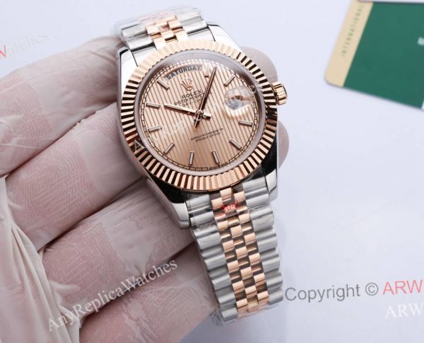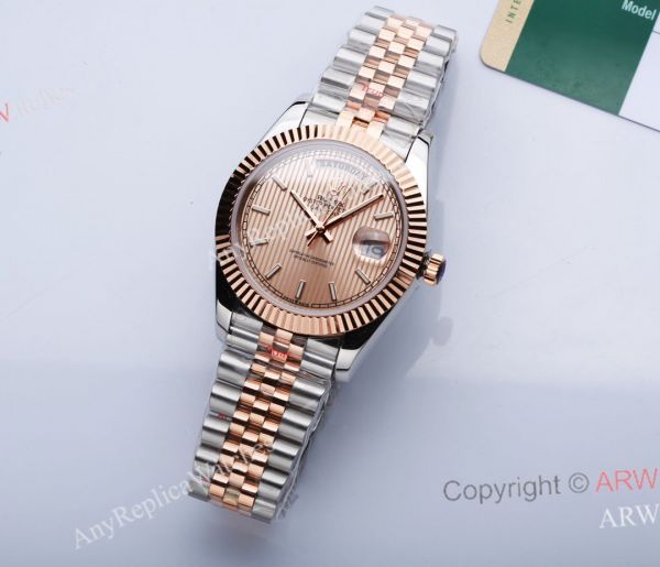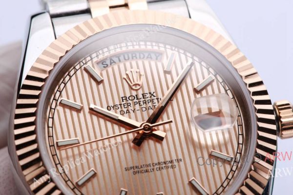 New Rolex Day Date rose gold striped dial with fluted bezel, 904L stainless steel coated rose gold case, jubilee bracelet with folding clasp