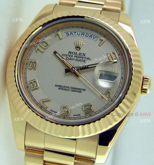 Replica Rolex Day-Date Ii Watch - Yellow Gold White Dial Arabic Markers Men Size