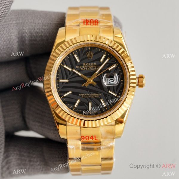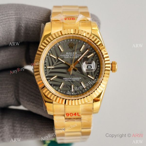 The Rolex Oyster Perpetual Datejust II 41mm with a fluted bezel, NEW Gold Palm dial and Yellow Gold Rolex Oyster bracelet