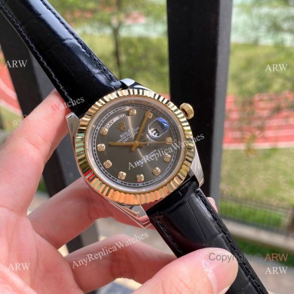 316L Stainless Steel case Black Diamond dial Black Leather Band and Gold bezel Day Date Watch 40MM