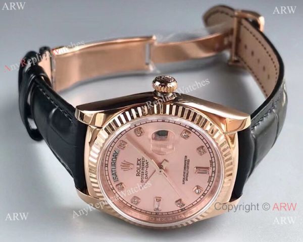 Rose gold 904L Case Salmon Dial Black Leather Strap Watch