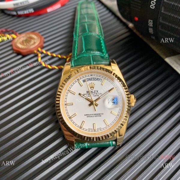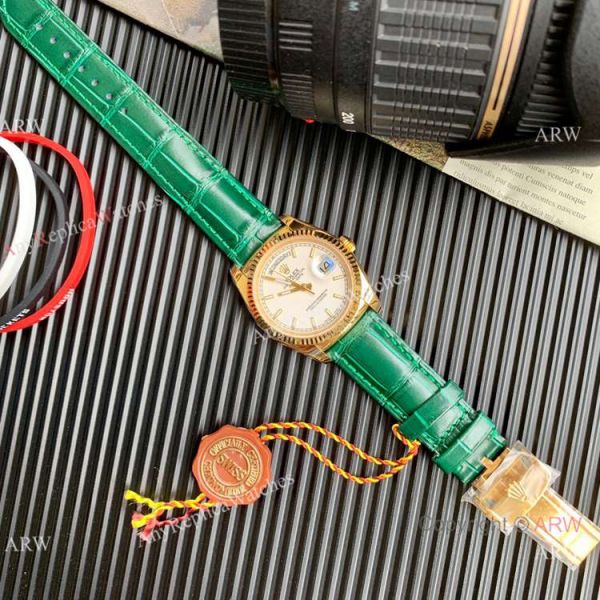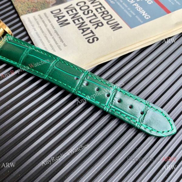 Pure 316L Yellow Gold Case White Dial Green Leather Strap Watch