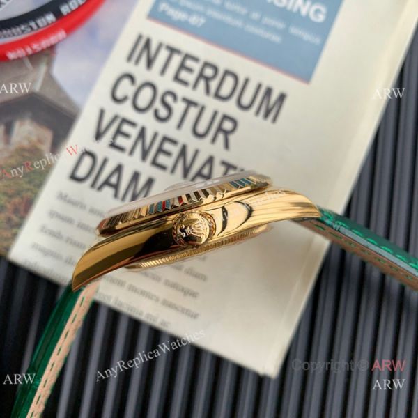 Band Material: Green Leather Watch Band with Rolex Logo on Buckle