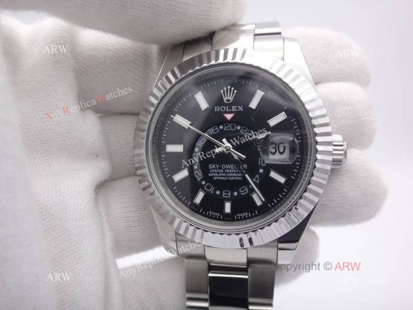 Black date marker at 3 o'clock position. They date does not work on all replica Rolex Sky Dweller watches
