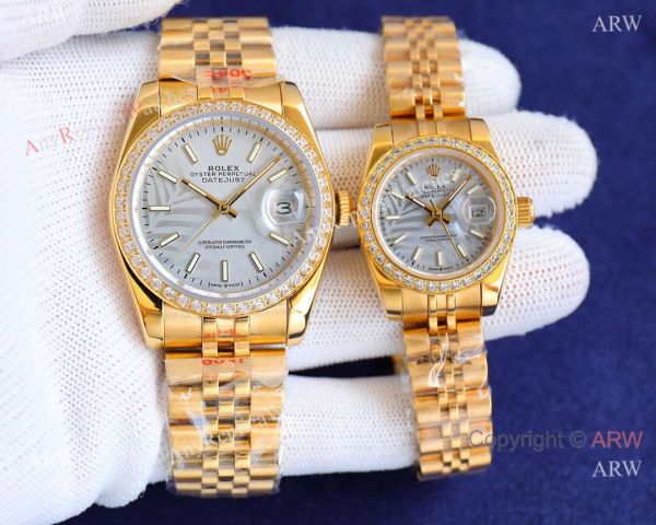 904L Yellow Gold Case Jubilee Band Silver Palm Dial and Fluted Bezel Lovers Watches