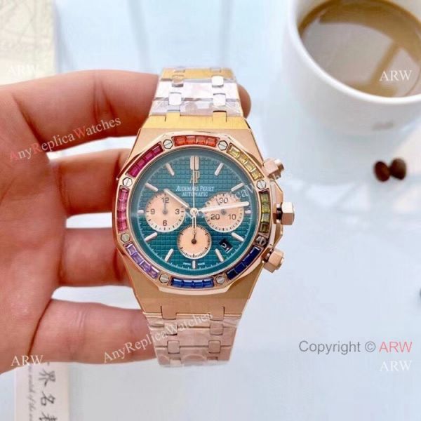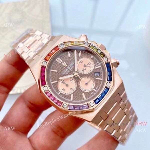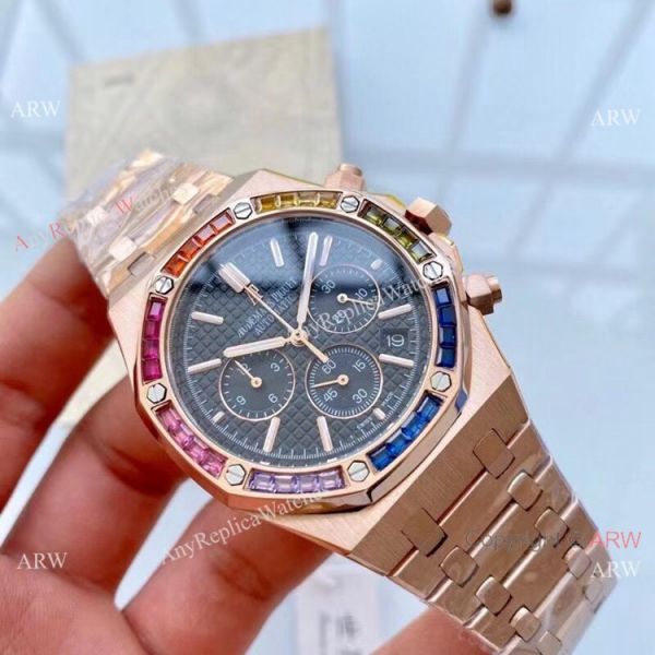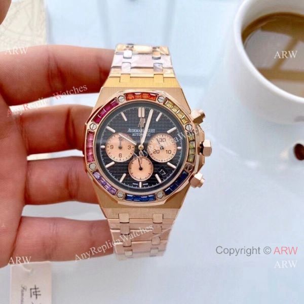 Check the bottom images for more detail of the Copy Audemars Piguet Royal Oak Rainbow Bezel Chronograph Watch. You will receive the exact copy watch as shown. Accept credit card payment online.