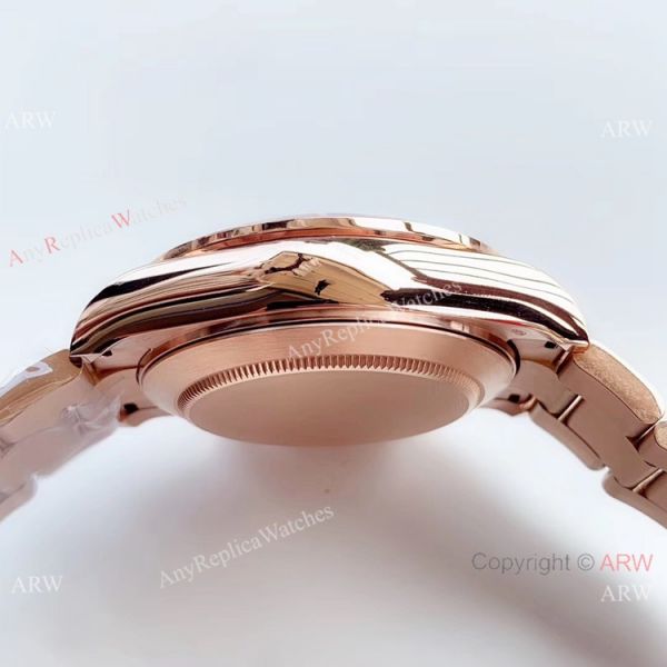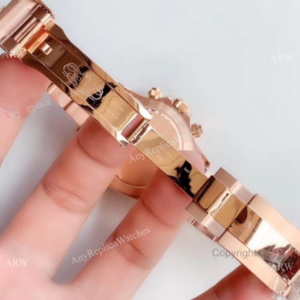 Watch Band: Rose Gold plated 316l Stainless Steel Rolex watch bracelet with hidden clasp displaying the Rolex logo. easy adjustable screw links.