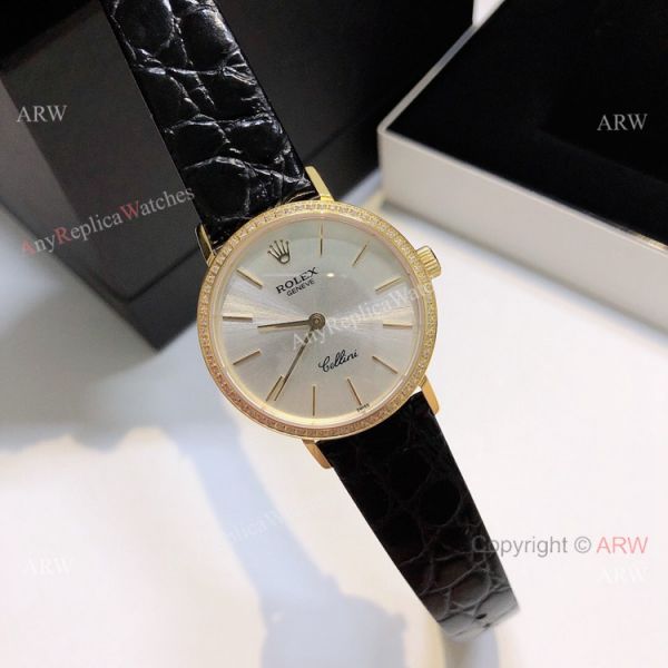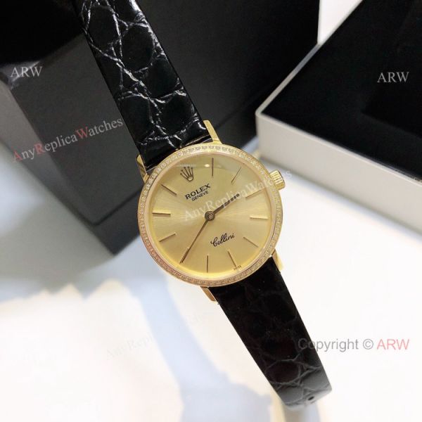 Diamond Rolex Cellini Ladies Leather Strap Yellow Gold Watch Replica