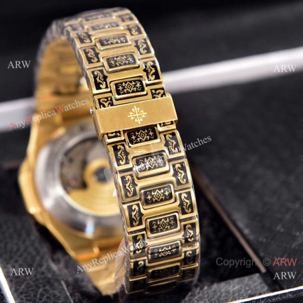 Yellow Gold Engraving Case and Bracelet Blue Dial Replica Nautilus Watch