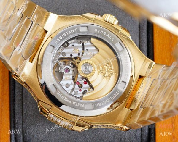 Swiss AAA Replica Patek Philippe Nautilus Iced Out Yellow Gold Watch 40mm 9015 Ultra-thin Movement