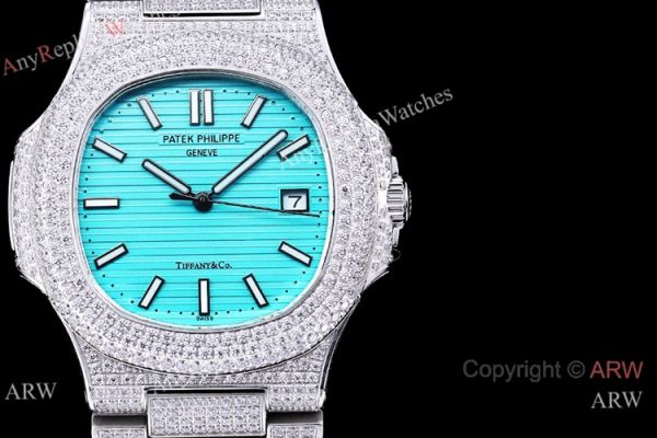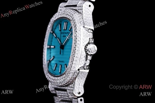Swiss Grade Copy Iced Out Patek Philippe Nautilus Baby Blue Watch for sale. We only sell the highest quality Patek Philippe replicas. we are experienced on shipping to worldwide with best way. 100% customer satisfaction guaranteed.