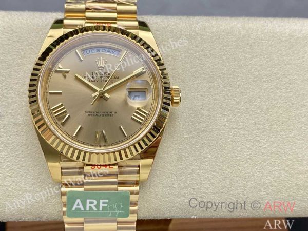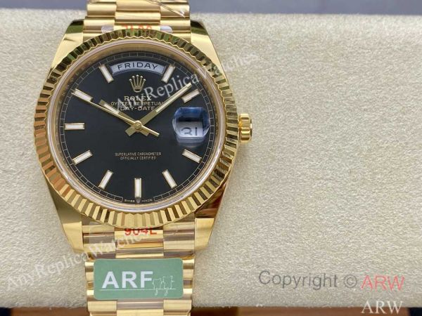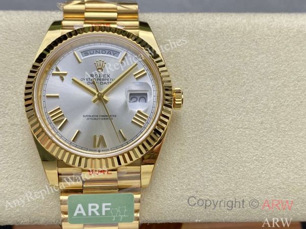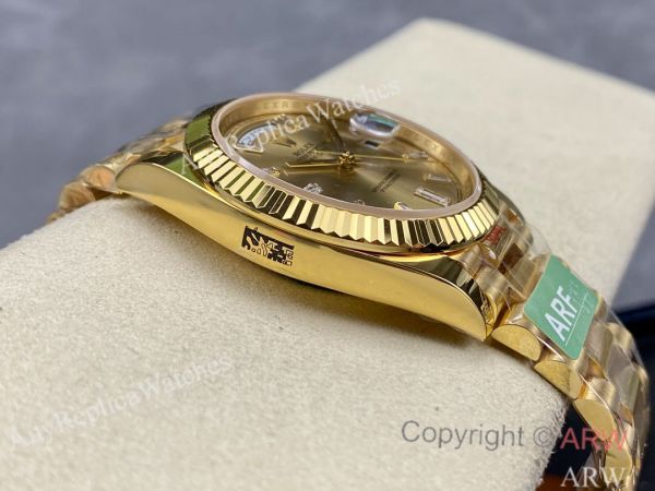 1:1 Super Clone Replica Rolex Daydate 40 Gold Baguette Diamond Dial Watch with the best color, movement, all perfect details the same as genuine. You will receive the exact one shown in the images on the bottom. Two-years free warranty and lifetime repair service. You will get 100% satisfaction