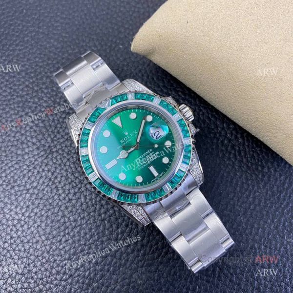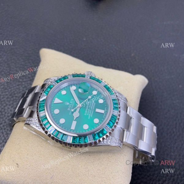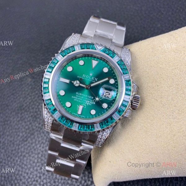 Knockoff Asian ETA Rolex Submariner Watch - Stainless Steel Green & Silver Diamond Bezel For Sale