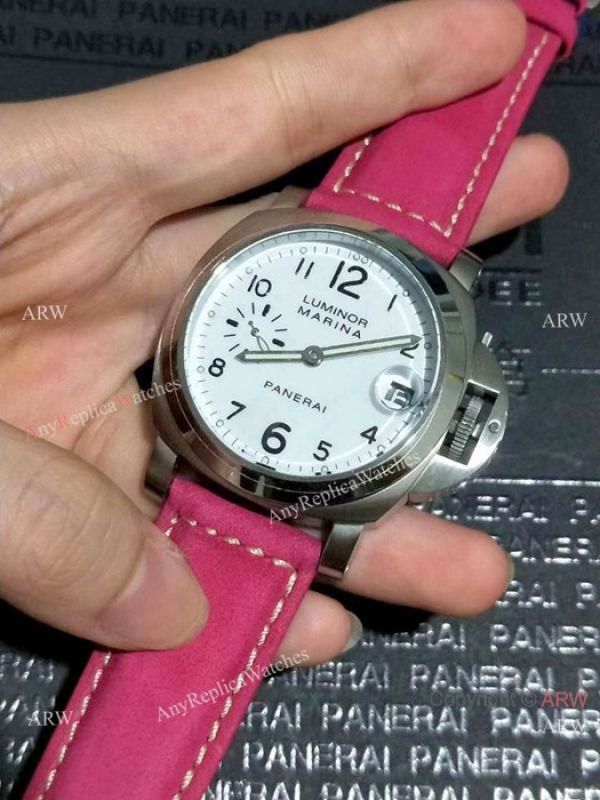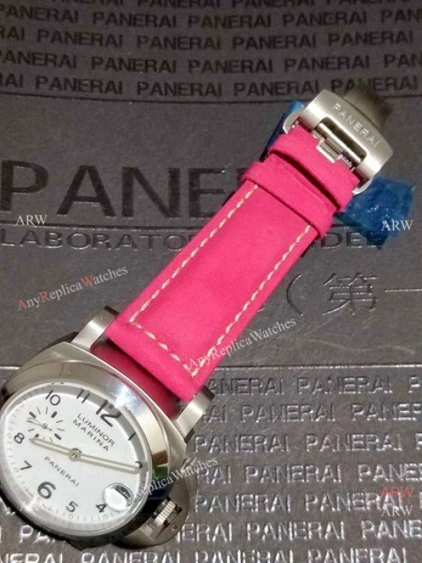 316L Stainless Steel case, White Dial, Black Markers, Pink leather band with PANERAI personalised buckle