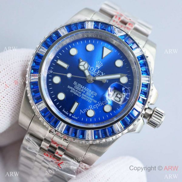 904l Stainless Steel Case Jubilee Band Blue Dial Square Diamonds Bezel Watch