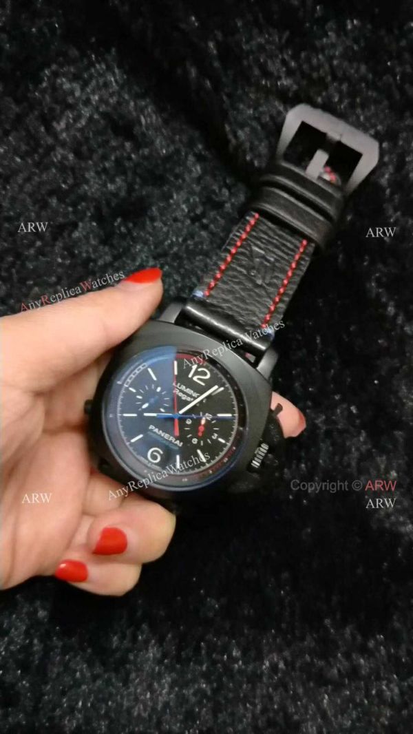 Black plated Solid 316L Steel case, Black dial w/ White Arabic Markers, Black Leather Band Panerai Luminor Regatta Replica watch.