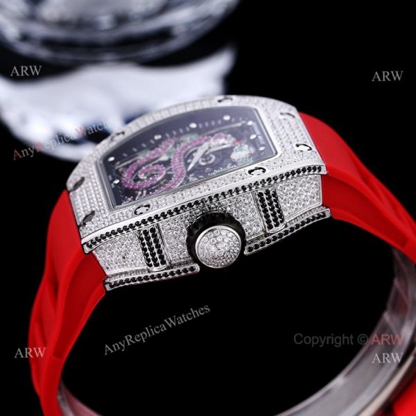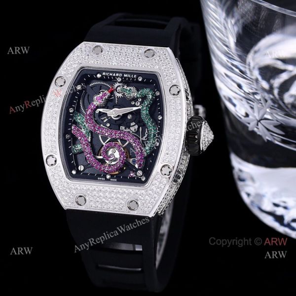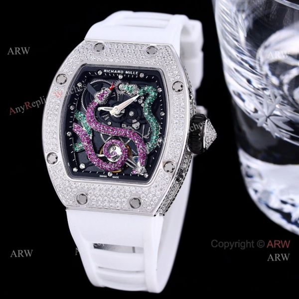 Silver Diamond Case - Diamond Bezel - Red Rubber Band - Diamonds Snake Tourbillon Dial Richard Mille Watch