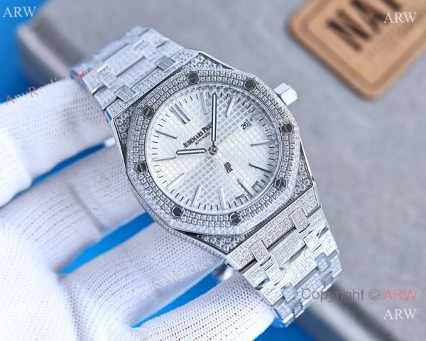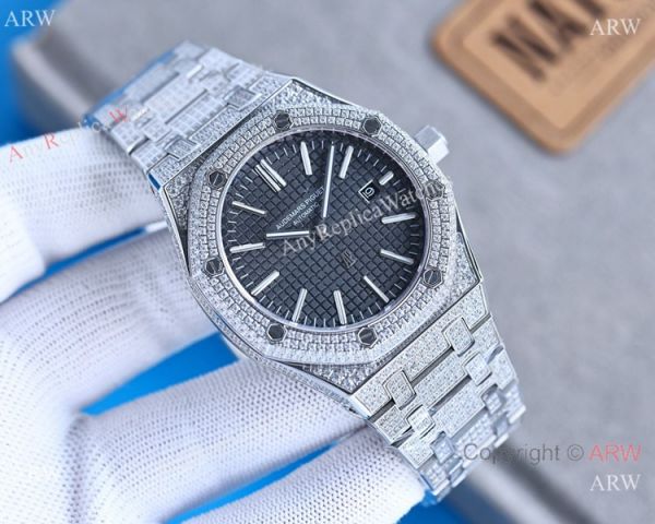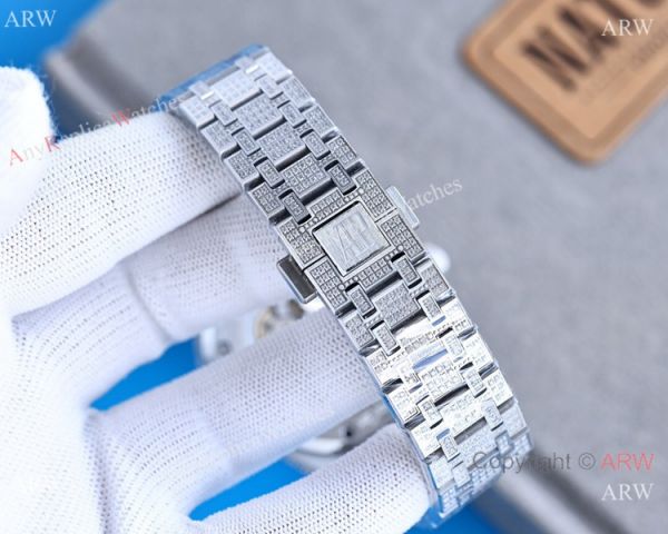 Stainless steel Iced Out Case Black Face for this Replica Iced Out Audemar 15202 Watch