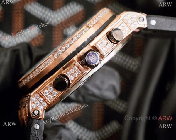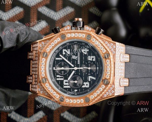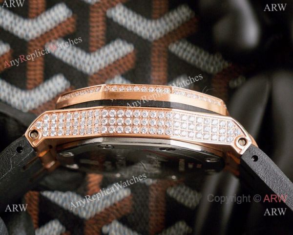 Rose Gold Diamond Case Black Rubber Bracelet Black Face with Arabic markers Iced Out Audemars Replica Watch