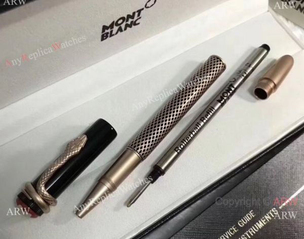 The Replica Mont Blanc Rouge Et Noir Rose Gold snake Rollerball pens we sell they are with diamond on the clip. However we do not guarantee that you will receive the same color diamond as shown on our site Replica Mont Blanc Pens. We have many color of diamonds. Everytime may different color. Sometimes blue diamond, sometimes white, sometimes purple. If you want a specific color of diamond on the clip. Please contact us. we will check our inventory if have that color or not.