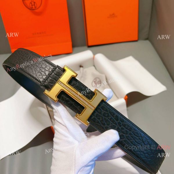 Black Pebble-styled Leather Belt & Gold H Buckle Diamond-set