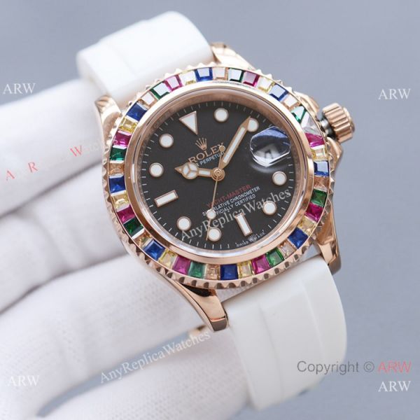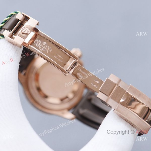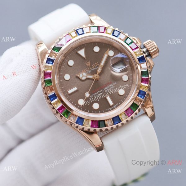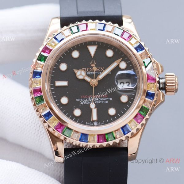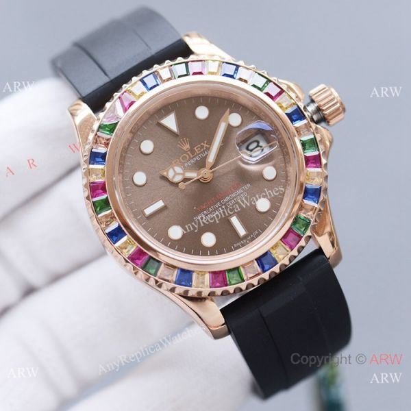 Swiss Quality 316L Stainless steel watch case coated Rose Gold - Brown Dial - Rainbow Bezel - Rolex Rubber Strap Yachtmaster 116695sats Watch
