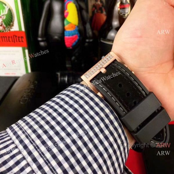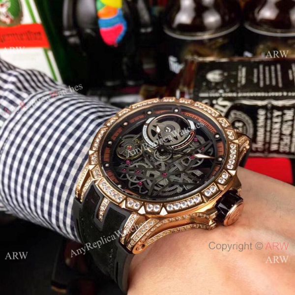 316L Rose Gold Diamonds Case Black Gummy Strap Skeleton Face Roger Dubuis Diamond Watches