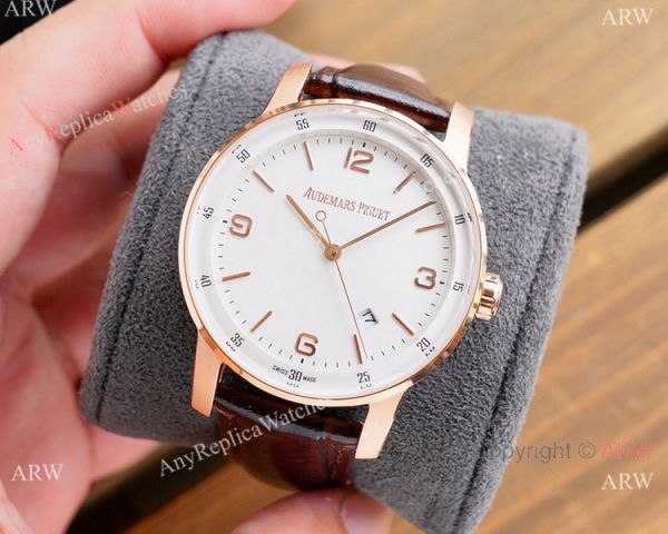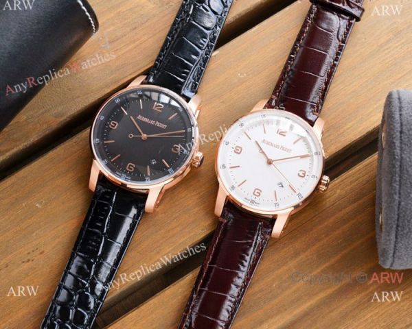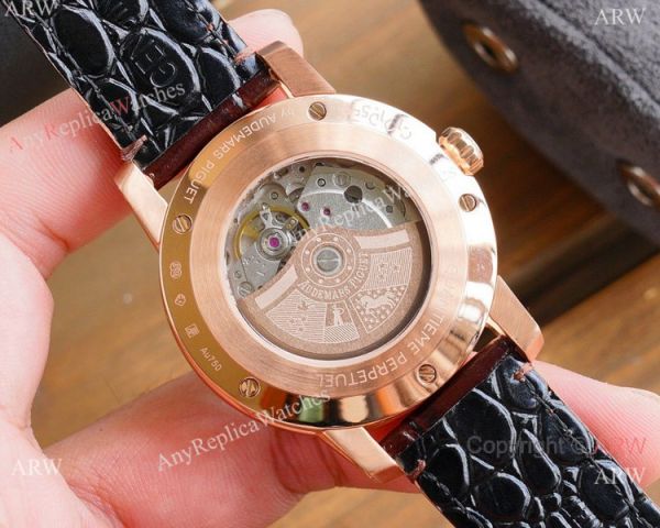 316L Rose Gold Case White Face Black Leather Strap Audemars Piguet Watch