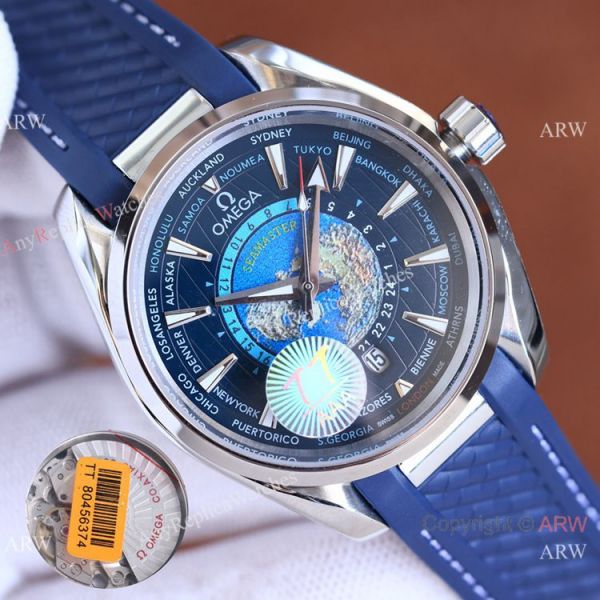 Swiss Quality Omega Aqua Terra Worldtimer Blue Rubber Watch