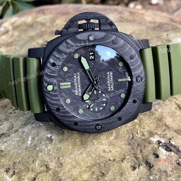 Bracelet: Best Quality Panerai Green Rubber Bracelet with Panerai Logo on Buckle, which admittedly gives a (very) robust look to this Submersible Marina Militare Carbotech.