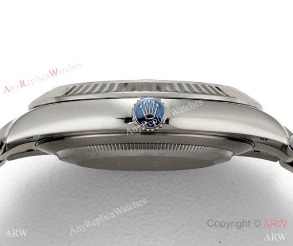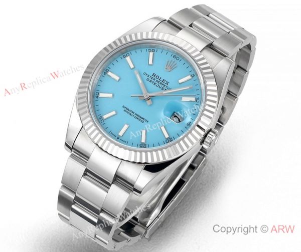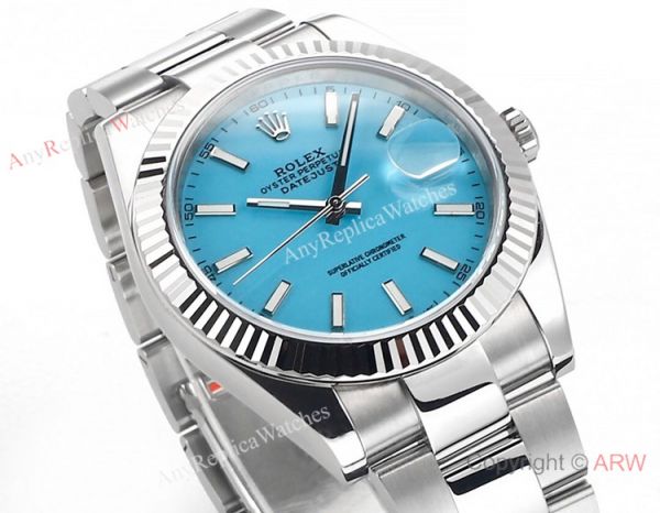 Dial: Baby Blue Dial with Rolex crown between swiss made at 6'o clock