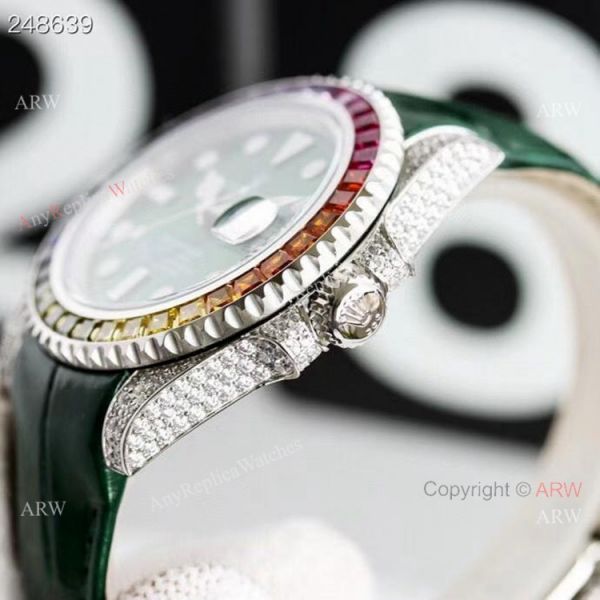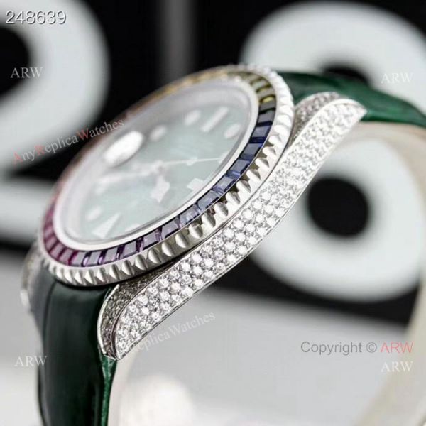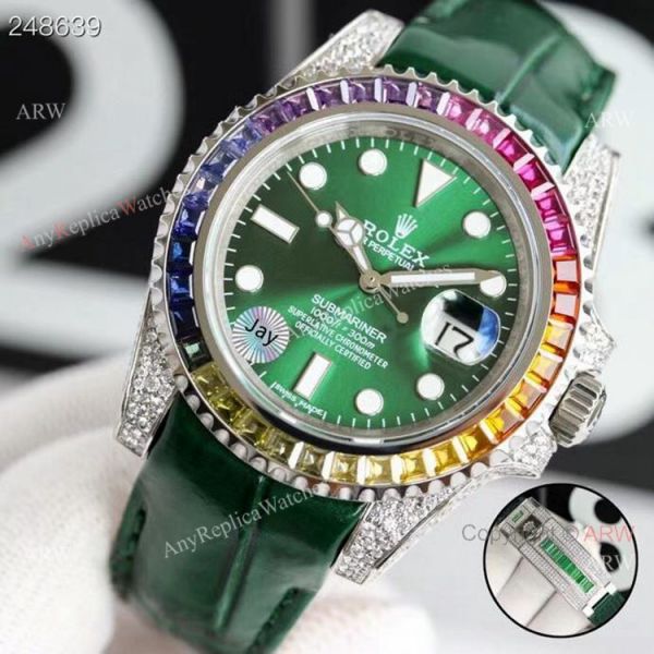 904L Stainless Steel case / rainbow diamond bezel / Green Dial / Green Leather Strap with diamonds clasp Rolex Submariner Replica Watch Buy Online